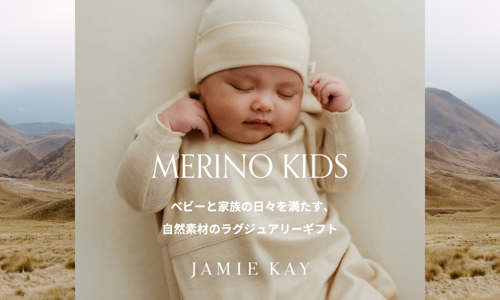 『JAMIE KAY』ならではの可愛らしさと上質な素材感を兼ね備えた、 プレミアムなベビースリープウエア・ギフトセットをご用意しました。 ニュージーランド産の国際認証基準である RWS(Responsible Wool Standard)認証スーパーファインメリノウールを 100%使用した"MERINO KIDS"のスリーパーやおくるみに、 赤ちゃんのファースト・トイとしても好評のぬいぐるみ、うさぎのペネロペを組み合わせた、 『JAMIE KAY』だけの特別なギフトセット。 ぜひこの特別なやわらかさとあたたかさを、実際に手に取ってご覧くださいませ。 出産のお祝いや、大切な方へのギフトとしてもぜひおすすめです。 ※"MERINO KIDS" Luxury Gift Boxは、 大きなリボンを掛けた特別なピュアホワイトのBOXに入ったセットとなります。 ※"MERINO KIDS"単品での販売はございません。 ※"MERINO KIDS" Luxury Gift Boxを、直営店舗にてお買い上げの方には エコストアのデリケート&ウールウォッシュ 100ml(非売サイズ)をプレゼントします。