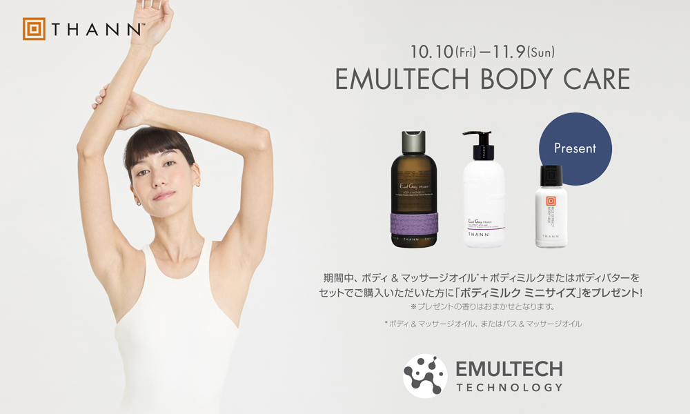 10月10日(金)~11月9日(日)EMULTECH BODY CARE キャンペーンを開催いたします! 期間中、ボディ&マッサージオイル+ボディミルクまたはボディバターをセットでご購入いただいた方に