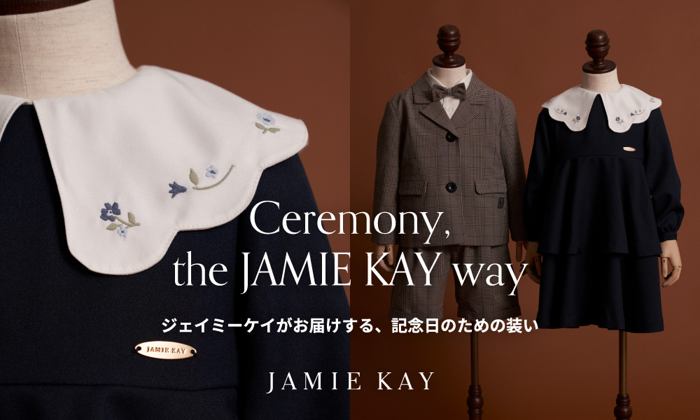 <Ceremony, the JAMIE KAY way> 小さな一歩が大きな一歩に変わる日。 成長を祝うセレモニースタイル。 家族みんなで重ねてきた時間が、 ひとつの節目を迎える日に。 きちんとだけじゃない、 子どもらしさとおしゃれ心を忘れないこと。 上質な素材と優しい色合い、 ほんの少しの遊び心をデザインに込めること。 それが、私たちの"the JAMIE KAY way"。 成長を祝う日のための装い。 JAMIE KAYのセレモニースタイルの提案です。 STYLE 01 ティアードフリルがふんわり揺れる、 やさしいAラインシルエットのワンピース。 きちんと感はありながらも動きやすく、 ただでさえ緊張しがちなセレモニーの一日も快適に過ごせます。 どんなランドセルにも合うソリッドカラーが上品な印象に引き立てます。 付け襟はレースとお花刺繍の2種類が付属。 卒園式と入学式で印象を変えるなど、 シーンや気分に合わせてアレンジを楽しめる1着です。 3Way衿付きフレアワンピース ¥18,700 サイズ 110/120/130 カラー LBEG/NVY オーガンジーカチューシャ ¥3,300 サイズ F カラー IVR STYLE 02 元気に動きたいお子さまにも ストレスフリーな着心地が叶うBOYSシリーズ。 ベーシックで洗練されたシルエットのジャケット&ハーフパンツは 卒園式や入学式などどんな場面でもきちんと感を演出します。 それぞれが単品使いもしやすく、 普段の外出からフォーマルまで長く活躍する万能なセットアップです。 快適なカットソー素材のNVYと、 よりきちんと見えが叶うシックなチェック柄を展開。 フォーマルジャケット ¥16,500 フォーマルハーフパンツ ¥8,800 サイズ 110/120/130 カラー NVY/CHECK 吸汗性、速乾性に優れ、接触冷感のある オーガニックコットン素材を使用したオックスシャツ。 入園・入学や卒園式にはもちろん、 発表会や結婚式、 またお出かけや集まりのシーンにも活躍します。 オックスシャツ ¥8,800 サイズ 110/120/130 カラー OWHT/LBLU リボンネクタイ ¥3,300 サイズ F カラー LBLU/CHECK LBLUはオックスシャツと、 CHECKはジャケット&パンツとお揃いです。 STYLE 03 上品なボレロジャケットと半袖ワンピースのセットアップ。 ブラウンはシックで落ち着いた印象に、 ピンクは華やかでハレの日に映えるカラー。 写真映えも抜群で、大切な一日の記念撮影にもぴったりです。 やわらかな着心地で長時間のセレモニーも快適に。 ワンピースの衿は取り外し可能で、2wayの着こなしを楽しめます。 2Wayチェックワンピース+ボレロセット ¥29,700 サイズ 110/120/130 カラー PNK/CHECK 未就学児から新しいステージを迎える皆様へ "はじめてのフォーマル"も、 背伸びしすぎず、自然体で迎えられますように... ぜひこの機会に JAMIE KAY表参道ヒルズ店へお越しくださいませ。 皆さまのご来店を心からお待ちしております。