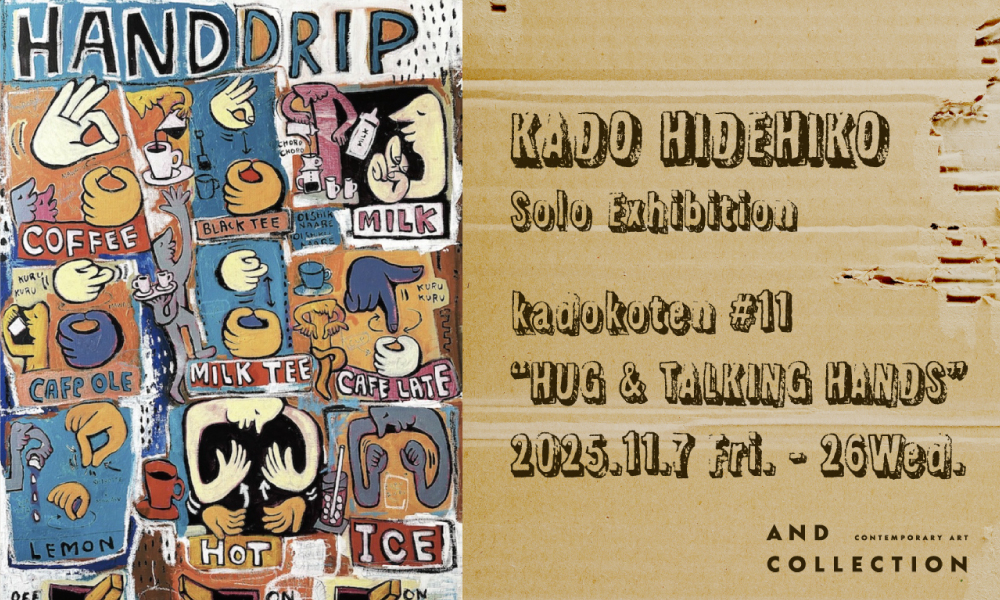 この度、AND COLLECTION Contemporary Artでは門 秀彦の個展「kadokoten #11 "HUG & TALKING HANDS"」を開催いたします。 門 秀彦はろう者の両親のもとに生まれたコーダであり、幼い頃から両親や周囲とのコミュニケーションの一つとして、絵を通じて自分の思いや感じたことを表現してきました。 やがてその表現方法は、ことばを超えて人と人とをつなぐ独自のアートスタイルへと発展していきました。 やさしさが溶け込んだ作品の数々はわたしたちに「伝える」ことの本質や心で通い合うコミュニケーションの豊かさを静かに語りかけています。 是非、この機会に門 秀彦の温かな世界観と人と人をつなぐアートの力をギャラリーにてご体感ください。 ■門 秀彦 - Hidehiko Kado ろう者の両親をもつ*コーダ(CODA)であり、音声言語や手話だけでは伝えきれない思いを表現するため、幼少期より絵を描き始める。作品には日本手話の指の動きや身振りをモチーフにしたオリジナルキャラクターが描かれ、「手話アート」として知られている。「Smile Talking Hands」をコンセプトに掲げ、自身のアートやグッズ、国内外でのワークショップ活動を通じて、誰もが互いに理解し合い、心のつながりを感じられる温かい交流の場を創出している。ろう学校で非常勤講師を務めたほか、全国で講演会やライブペインティングを精力的に展開。スターバックスやNHKをはじめとする企業・メディアとも幅広く協働し、言葉を超えた無限のコミュニケーションの温もりを世界に発信している。 *CODA(Children of Deaf Adults)...耳が聞こえない、または聞こえにくい親のもとで育つ子ども。 ※個展詳細は下記Viewing Roomよりご確認ください。 Viewing Room ◼︎個展詳細 個展「kadokoten #11 "HUG & TALKING HANDS"」 会期:2025年11月7日(金)~ 26日(水) レセプションパーティー:2025年11月7日(金)18:00~20:00(予約不要) 作家在郎日:11月7日(金) 17:00~20:00 / 11月8日(土)、9日(日)、15日(土) 、22日(土)、23日(日) 14:00~16:00 ◼︎ライブペインティング開催決定! 会期:2025年11月9日(日)14:00~ その場で描かれる"生のアート"を体感できる貴重な機会です。 見る人の心をやさしく包む門 秀彦の世界をぜひ会場でご覧ください。