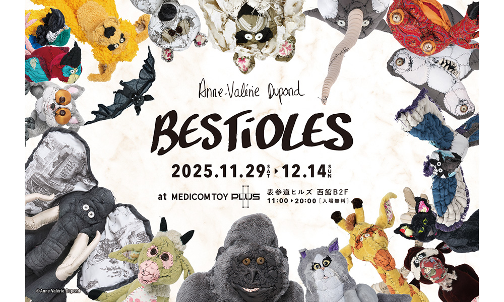 世界的に活躍するフランス人アーティストAnne Valérie Dupond (アン・ヴァレリー・デュポン) による新作展示会「Bestioles (ベスティオール)」を、「MEDICOM TOY PLUS」にて開催いたします。 フランス語で親しみを込めて"奇妙な生き物たち"というニュアンスで使われる「Bestioles」をタイトルに掲げた本展では、彼女の原点ともいえる動物をモチーフにしたテキスタイル彫刻作品や「ONE OF KIND BE@RBRICK 1000%」、花と動物のブローチなどの新作113点を一挙に展示いたします。展示作品の一部は店頭にて販売を行うほか、本展の開催を記念したオリジナルグッズも発売いたします。 また、会期初日にはAnne Valérie Dupond本人が来場し、作品制作のデモンストレーションやサイン会も行われます。 どこか親しみと優しさを感じさせる"奇妙な生き物たち" との出会いを、ぜひ会場でお楽しみください。 Anne Valérie Dupond (アン・ヴァレリー・デュポン) 1976年生まれ。フランスのストラスブールにあるMarc Bloch Universityにて学び、2000年にFine Artsの修士号を取得。 2001年からデュポンはフランス、アメリカ、そして日本のそれぞれのギャラリーで活動。デュポンの作品は世界中に発信されるだけでなく、ファッションブランドのKenzo、Undercover、Le Printemps、Comme des Garçons、Y'sや MEDICOM TOYなど多くの注目を集めるプロジェクトを多々手掛けている。 ■展示会 Bestioles (ベスティオール) 会期:2025年11月29日(土) ~ 12月14日(日) ※会期中無休 開場時間:11:00 ~ 20:00 詳細URL ⇒ https://www.medicomtoy.co.jp/information/bestioles.php ※イベント設営のため、11月27日(木)は「MEDICOM TOY PLUS」を17:00閉店とさせていただきます。 20点のONE OF KIND BE@RBRICK 1000%は、 会場及びオンラインからご応募を受け付ける抽選販売となります。 Tシャツ、クルーネックスウェットシャツ、トートバッグ、 ダイカットクッションなどのアパレルグッズも発売します。 ■「Bestioles」開催記念 特別イベント 日時:2025年11月29日(土) 14:00 ~ 16:30(予定) ※事前のお申し込みは不要です。当日会場にお越しください。 ※13:45頃より、店舗スタッフが入場のご案内をいたします。 ※当日の運営状況により、開始・終了時間が若干前後する場合がございます。予めご了承ください。 Session 1:作品制作デモンストレーション(14:00 ~ 15:00) Anne Valérie Dupondが作品を仕上げていく工程のデモンストレーションを実施いたします。 制作した作品は、デモンストレーション後、本展「Bestioles」内にて展示予定です。 ※動画撮影はお控えください(写真撮影は可能です)。 ※混雑状況により、入場制限を行う場合があります。 Session 2:サイン会(15:00 ~ 16:30) 会場で販売される本展図録「"Bestioles" Exhibition Book」をご購入いただいた方を対象に、サイン会を実施いたします。 ※16:00時点で列にお並びいただいている方までの対応とさせていただきます。 ※サインは原則「"Bestioles" Exhibition Book」のみとさせていただきます。 お問い合わせ先: メディコム・トイ ユーザーサポート(平日11:00〜18:00) TEL:03-3460-7555 E-mail:usersupport@medicomtoy.co.jp
