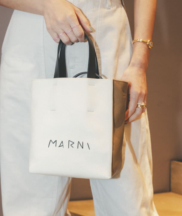 色&素材のバリエーション豊富「店内が可愛い!」ショップに足を踏み入れるなり興奮気味の百々さん。 MARNIの世界観をそのまま体感できるポップな店内は、2階まで続く。彼女がさっそく手にしたのは、サングラスとキャンバス素材の“TROPICALIA”ミニバケットバッグ。続いて、「絶妙な色合いが他にはない可愛さ」と、ショーケースに賑やかに並んでいる他の小物たちもくまなくチェック。シンプルなスタイリングだからこそ小物では遊ぶという百々さんにぴったりなMARNIのアイテム。