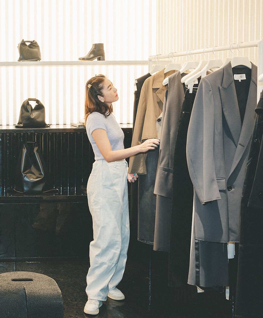 迷わずここに2024春夏コレクション「SHOW」は、縦の伸びやかなラインを探求。コレクションのキーワードである“エロンゲーション”(伸ばすこと)を反映した、丈が長めのジャケットやジレが店内に並ぶ。そして、マニュアルワーカーの手の動きを連想させるポケットの配置がユニークなトップスやワンショルダーのエプロンなど、その世界観が伝わるラインナップに。「MM6 Maison Margielaはお洋服もすごく好きでたくさん持っています。ディテールやシルエットへのこだわりが特別。一着で雰囲気が変わるんです。メンズライクなアイテムにはシーズン問わず惹かれます。この中では、オーバーサイズのジャケットが気になりました」