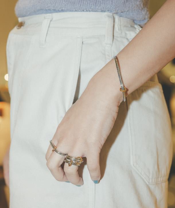 ダブルフィンガーリングが活躍百々さんが選んだアイテムのひとつ“Dune”コレクションは、砂丘に描き出された美しい風紋がモチーフ。シルバーのスレッドラインと存在感のあるK18の組み合わせが、大人のラフさを実現している。「ゴールド派ですが、シルバーもたまには楽しみたい。アクセントとなっているゴールドモチーフが手持ちのジュエリーとのバランスをとってくれるはず」もう一点は、緑のクロムダイオプサイトが美しく輝くダブルフィンガーリング。「ジュエリーのレイヤードを楽しむ時、フィンガーリングはワンアイテムでこなれた印象をプラスしてくれる強い味方です」