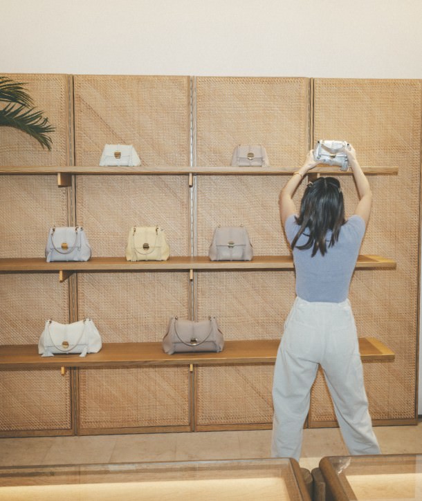 ビッグシルエットのスニーカーは白を選ぶ「MARNIはニットが好きで、シーズン問わずチェックしています。このモヘアニットは絶妙なカラーに一目惚れ」2階の奥に広がるカラフルな試着室で、新色の”MUSEO”ミニバッグとともに鏡を見ながら合わせる百々さん。バッグにほどこされたロゴは一つ一つ手作業で刺繍されている。「普段は黒のバッグを選びがちですが、この愛らしい刺繍が目立つよう白を選びました。刺繍がどれも少しずつ違うので、自分だけのスペシャル感が嬉しい。デニムなどのカジュアルな普段着に、この小さいサイズをさらりと持ちたいですね」試着を終えたあとは、シューズフロアへ。そこでも手に取ったスニーカーは白。白の小物が気になっている様子。