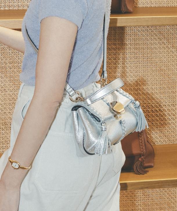 春らしさを取り入れる楽しそうに店内を見て回り、選んだのはシルバーのバッグ。「メタリック感とフリンジが今の気分にぴったり。シルバーメインですが金具がゴールドなので、定番のゴールドジュエリーともリンクして馴染みそう。今日の白パンツのような、白スタイリングに合わせたいと思います。バッグがとても華やかなので、あえてスタイリングはラフに。そういう差し引きが大人のこなれ感を導いてくれます」続いて注目したのは、代表的な“Marcie”シリーズのローファー。「ショップスタッフの方が履いているのを見て素敵だなって。きちんとしたスーツと合わせてみたい!と想像してしまいました」
