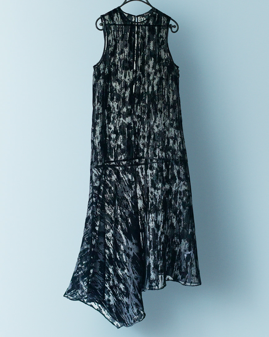 オパール加工を施したニュアンスのある透け感とアシンメトリーの立体的なシルエットで、着まわし力抜群。エディションオリジナル柄。ドレス¥47,300/Edition(エディション)