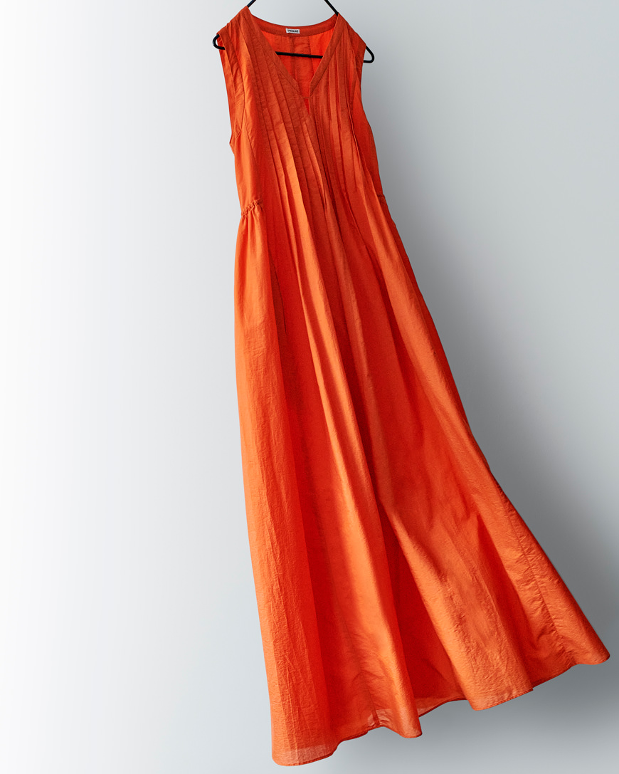 鮮やかなオレンジがキャッチーなドレスは、着心地のいい素材感と軽さがポイント。しわになりにくく速乾性にも優れます。ドレス ¥29,700/DRESSLAVE(ドレスレイブ)
