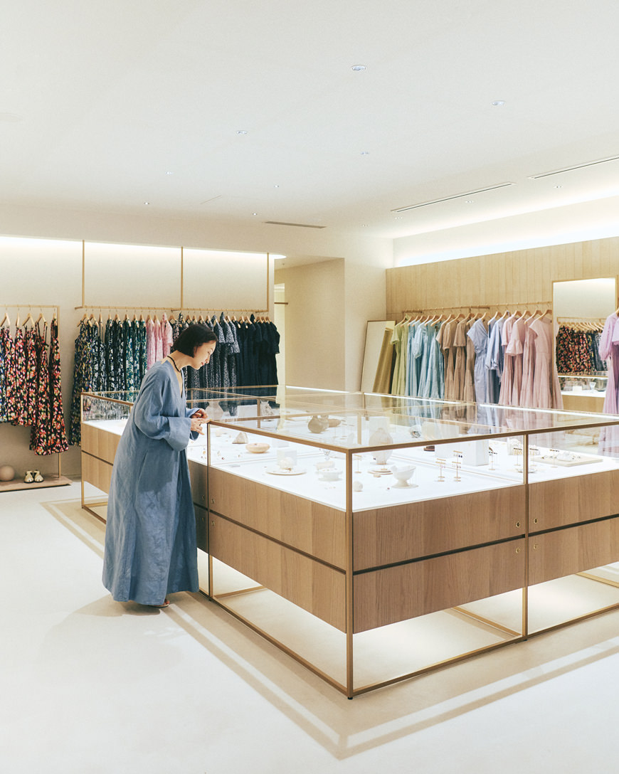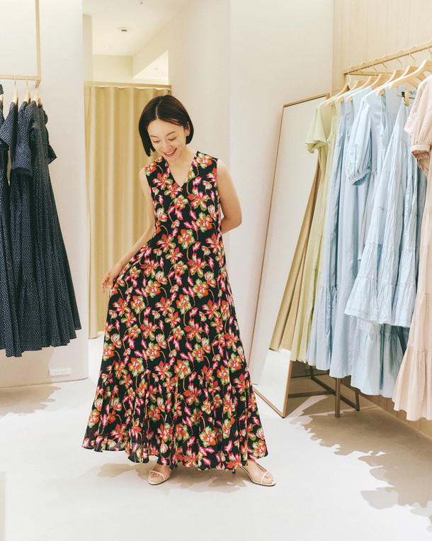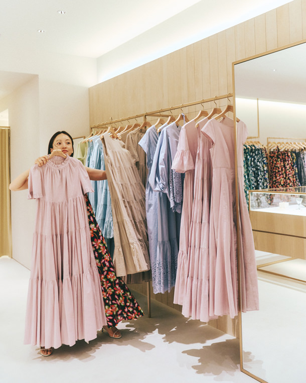 4月にオープンしたマリハは、花鳥風月をテーマにドレスやジュエリーを展開。ブランドカラーの白とゴールドを基調に天然の木材を生かした店内には、全ラインが揃います。「ロングドレスに目がないわたしにとって、大好きなブランドのひとつです。この色が今の気分にぴったりとかこのシルエットがきれいとか、その時の直感を信じて買うことが多いですね。ジュエリーもいくつか持っています。身につけることで、自信を取り戻せたり気分をあげてくれたり……。ショップスタッフさんに意見を聞きながらお買いものを楽しみたいです」