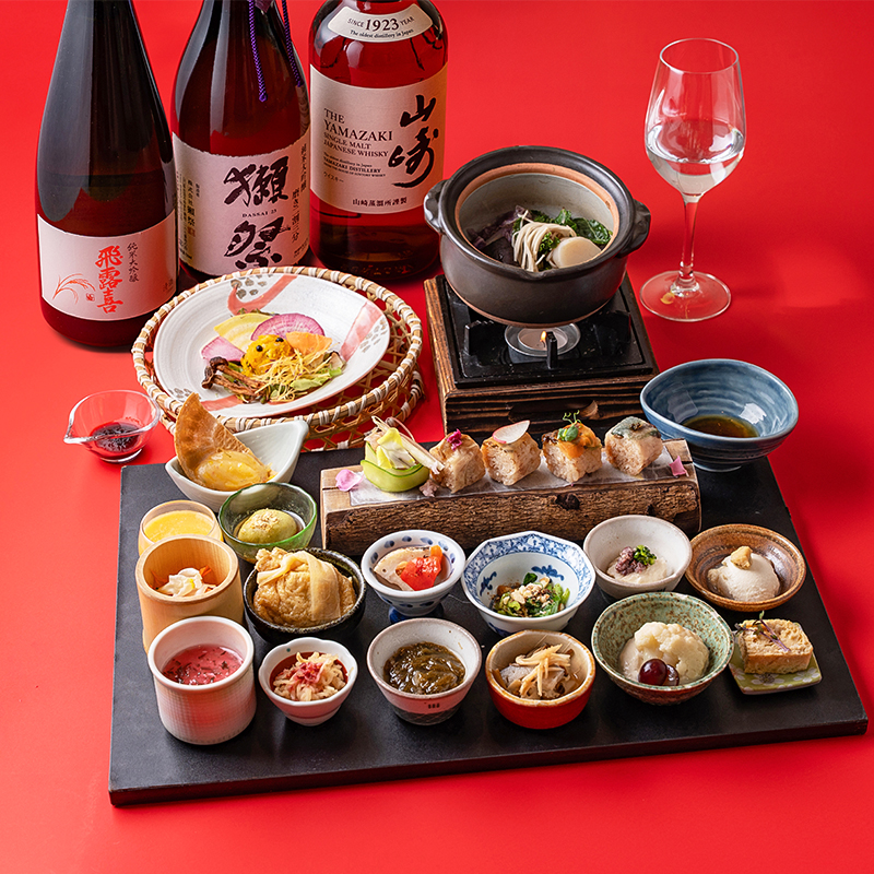 お野菜寿司五貫や小鍋、旬の小鉢十数種で構成された、美と健康がテーマの「うつくしの御膳」に、獺祭・飛露喜・山崎より選べる銘酒一杯を特別にお付けした、新年を祝う豪華セットです。