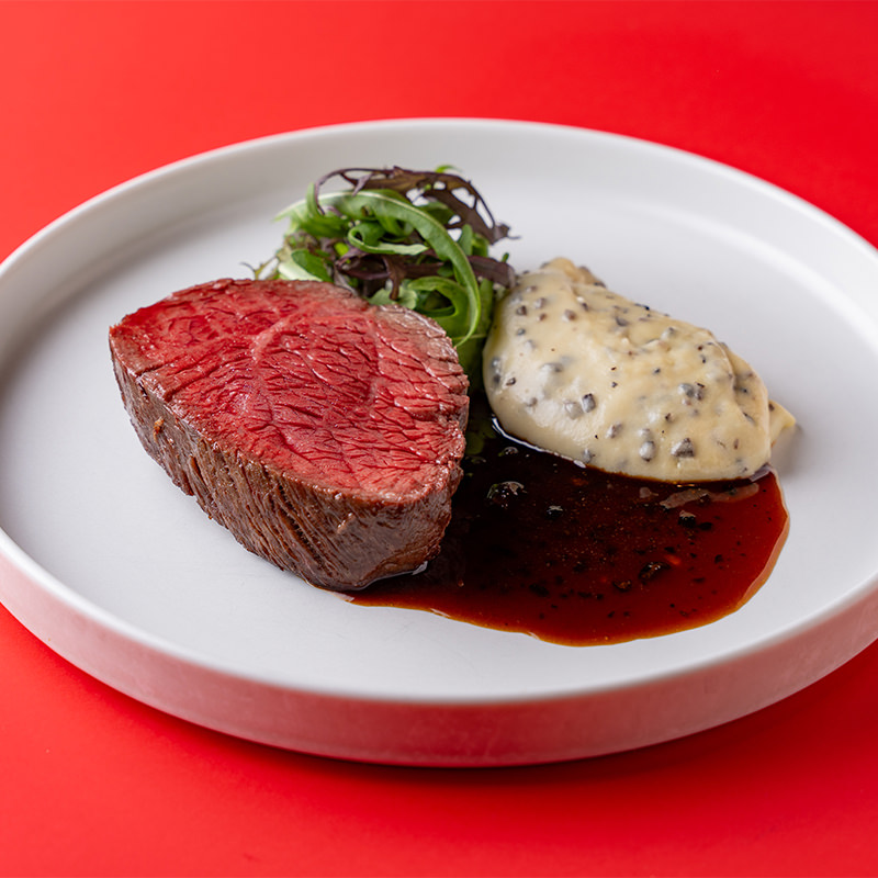 上質な飛騨牛をゆっくりとローストして贅沢に黒トリュフを使用した香り高いソースで仕上げた一皿。※アラカルトだけではなく、ディナーコースに+1,800円のアップチャージでもご注文いただけます。
