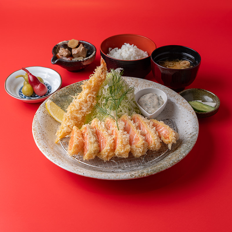 - レアサーモンカツと海老フライの寿御膳
