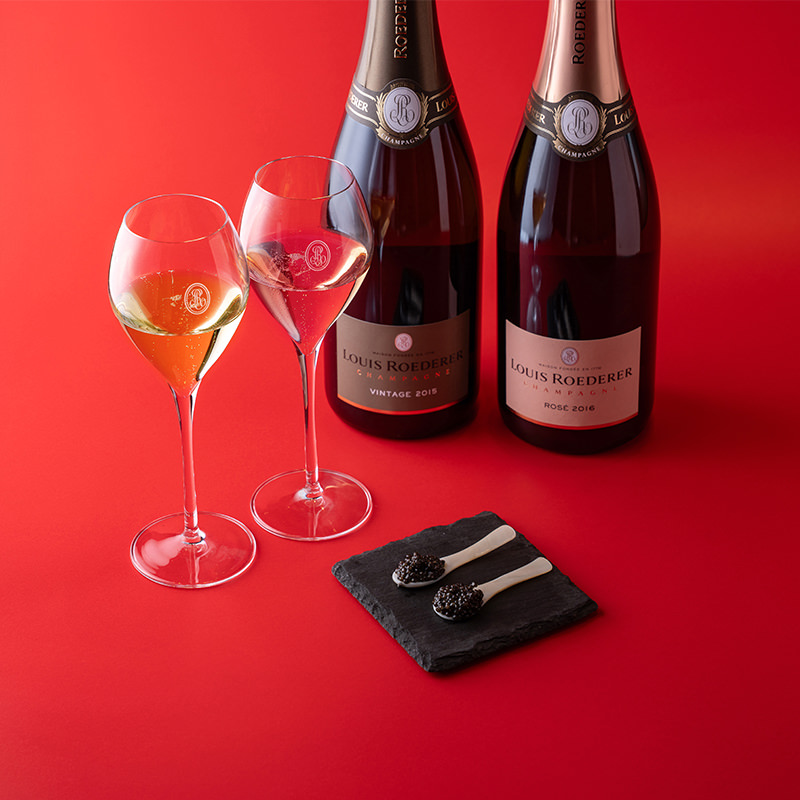 フランス産のフレッシュキャビア2スプーンと、世界最高峰の老舗シャンパーニュ・メゾン「ルイ・ロデレール」の上級キュヴェ白&ロゼ2杯のペアリングセット。キャビアの濃厚な旨味に、白は豊かなミネラル感、ロゼは鮮やかな果実味が組み合わさり、それぞれ異なるマリアージュをお楽しみいただけます。