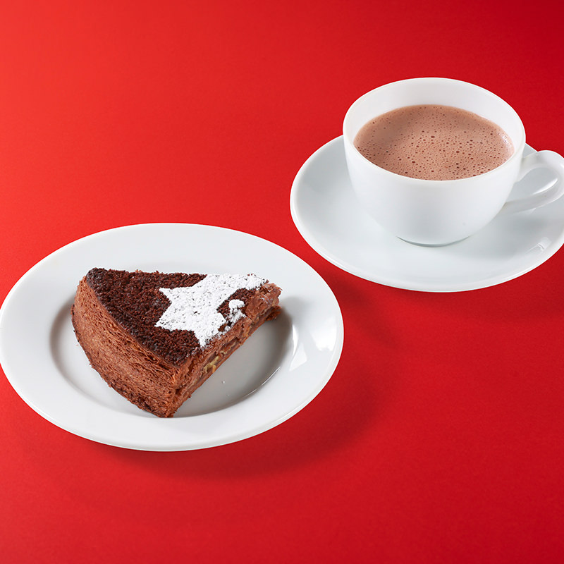 カメルーン産カカオとオレンジを合せたアーモンドクリームに、ペルー産カカオを使用したクリームを重ね、風味豊かなパイ生地で包み香ばしく焼き上げた「ガレット デ ロワ カスパール」とお好みのドリンク(ショコラ ショ パリジャン、ショコラ グラッセ、紅茶、コーヒー、ネクター)のセットメニュー。